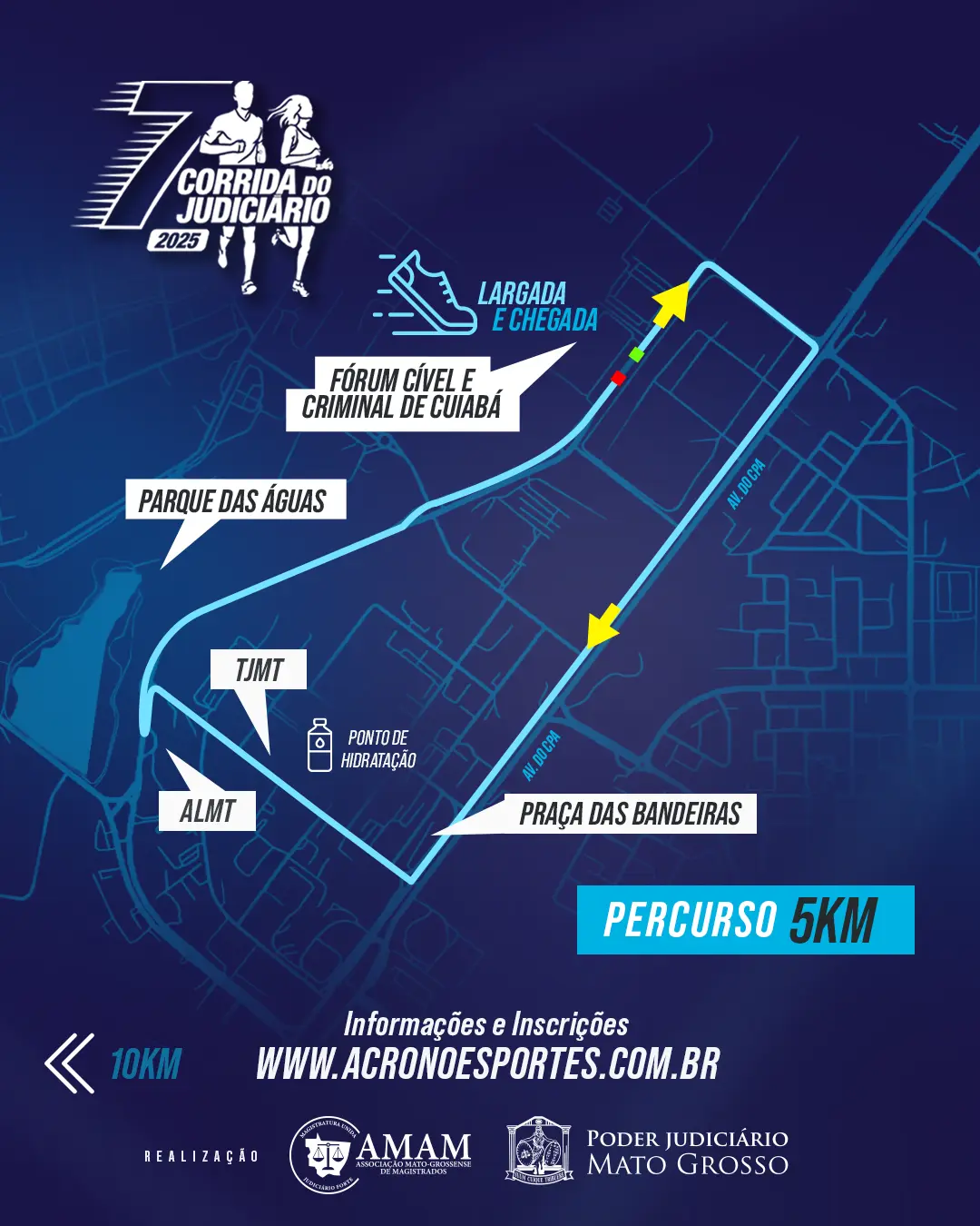 Percurso de 5 km: Após a largada, os corredores seguirão pela via de acesso ao INPE e farão a conversão à direita em direção à Avenida do CPA. O trajeto continua pela avenida até a Praça das Bandeiras, onde os atletas acessarão a Avenida Desembargador Carlos Avalone. A partir daí, contornarão o Parque das Águas e a Assembleia Legislativa (ALMT), retornando pela Avenida Desembargador Milton Figueiredo Ferreira Mendes até a linha de chegada.