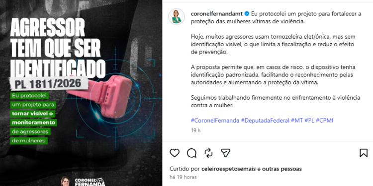 A deputada federal Coronel Fernanda (PL-MT) apresentou, nesta semana, um Projeto de Lei que propõe a adoção de uma identificação visual padronizada — incluindo a cor rosa — para tornozeleiras eletrônicas utilizadas por agressores de mulheres. A medida foca em homens monitorados por crimes de violência doméstica e busca dar mais efetividade à fiscalização.